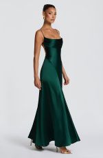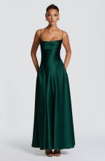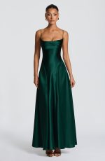 The Adelina Maxi Dress in emerald is crafted from luxurious non-stretch satin, this floor-length piece features a twisted cowl neckline with delicate spaghetti straps, a daringly open lace-up back, and a gracefully flared skirt enhanced by godet panels at the hips.