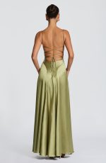 The Adelina Maxi Dress in Lemon is a sophisticated statement piece crafted from luxurious non-stretch satin. Features a striking twist cowl neckline and delicate spaghetti straps, paired with a low scooped open lace-up back for an elegant reveal. The flared skirt is enhanced with godet panels at the hips for graceful movement and dimension.