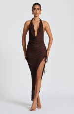 Take risks and stand out in our Airla Midi Dress! Made with a textured, cut and sew fabric, this plum brown dress features a plunging cowl neckline and halter straps for a bold look. The backless design and asymmetric midi skirt with ruching detail adds a touch of adventure to your style.