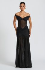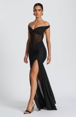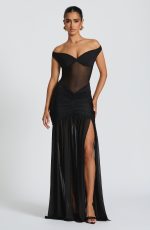 Elevate your evening attire with the Alaia Maxi Dress in striking black. This sophisticated design features a sheer mesh bodice with an elegant bardot neckline and elasticated back strap for comfort. The skirt features a dropped waist with tight ruching across the hips for a sculpted look, flowing into a sheer skirt with a bold thigh-high split.