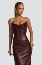 The Alba Maxi Dress in rich burgundy features a scooped neckline with elegant pleated cowl and an internal boned bodice for structure. Asymmetric pleating enhances the fitted silhouette, flowing into a column skirt with a daring thigh-high split for refined allure.