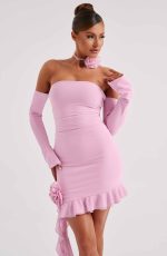 Super flirty and feminine, fall in love with the Alix mini. With an asymmetric, ruffled skirt hem and corsage detail, this off the shoulder design is complete with long sleeves.