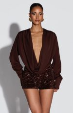 Amadi Shorts in plum brown showcase luxurious dense sequin velvet with an all-over shimmer. Cut as fitted, mid-rise hot pants, they deliver bold glamour for evening wear or statement styling. The rich plum brown tone adds depth and versatility to your occasion wardrobe.