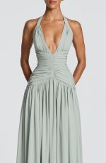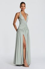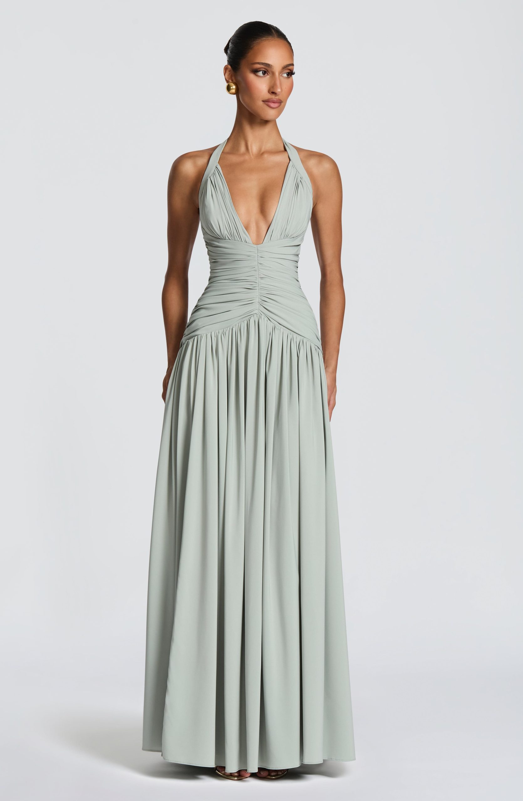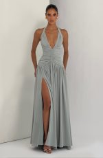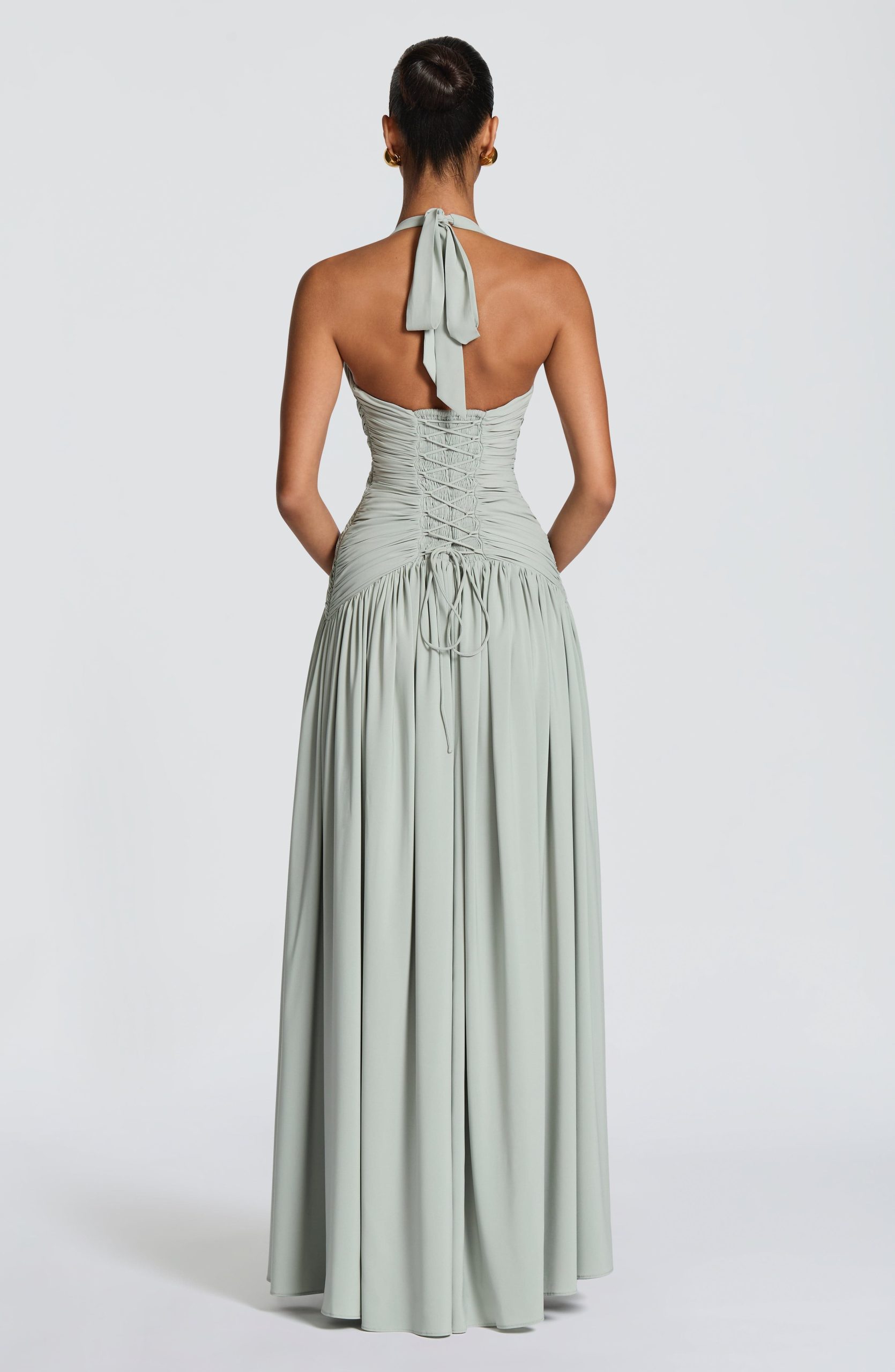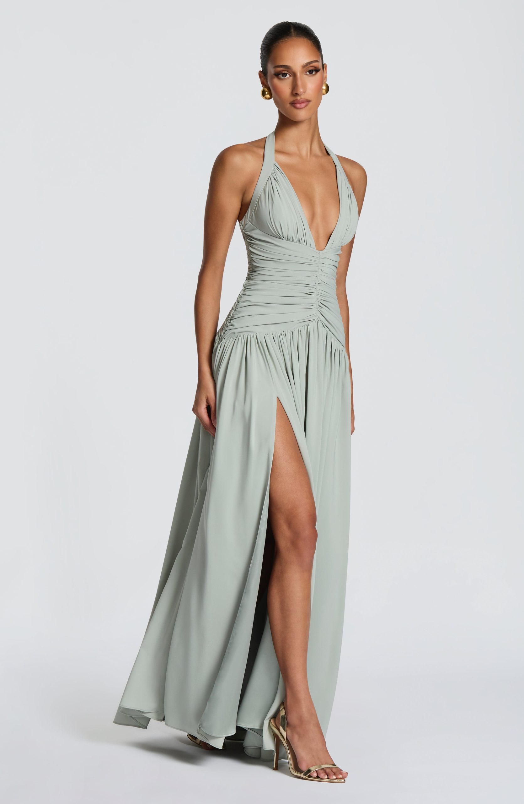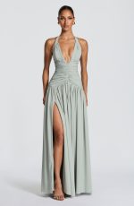 Amaris Maxi Dress in luxurious sage chiffon. Features a plunge halter neckline with gathered cup detail, ruched bodice with angled underbust shaping, and a lace-up back with smocked panel for a cinched silhouette. Flowing maxi length with a full gathered skirt and thigh-high split for effortless elegance.