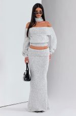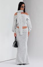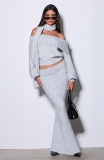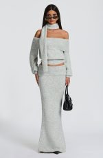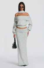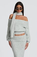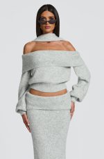 The Andie Top in Light Grey Marl features an elegant off-the-shoulder neckline with a wide fold-over panel. Its relaxed fit is balanced by a fitted ribbed waistband and cuffs, while the cropped length adds a modern touch. A coordinating scarf completes this refined look.