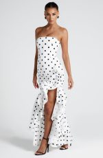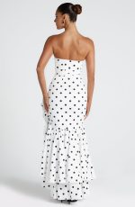The Angelina Maxi Dress in black polka dot is the perfect blend of timeless elegance and modern flair. Featuring a classic ivory base adorned with playful black polka dots, this strapless maxi-length dress is designed to make a statement. The contour princess seams and internal boning ensure a flattering, sculpted fit, while the voluminous frills on the hem add a dramatic, feminine touch.