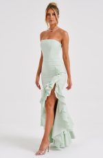 Enter your soft girl era in the Angelina maxi dress, crafted in our luxury non-stretch cotton blend fabric that hugs the body for the silhouette of dreams. This strapless design is complete with a voluminous frilled high low skirt that’s super pretty and playful.