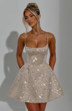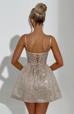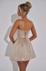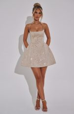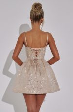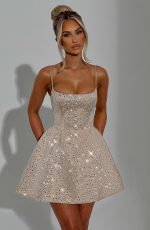 Champagne is the color of choice for our Angelique Mini Dress. Crafted from luxurious, non-stretch satin and fully lined, this opulent dress is adorned with a dazzling array of multi-shaped hotfix rhinestones. The square neckline and adjustable straps add to its sophistication, while the lace up back and invisible zipper fastening ensure a perfect fit. This mini dress exudes elegance and refinement, elevating any occasion.