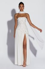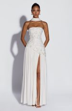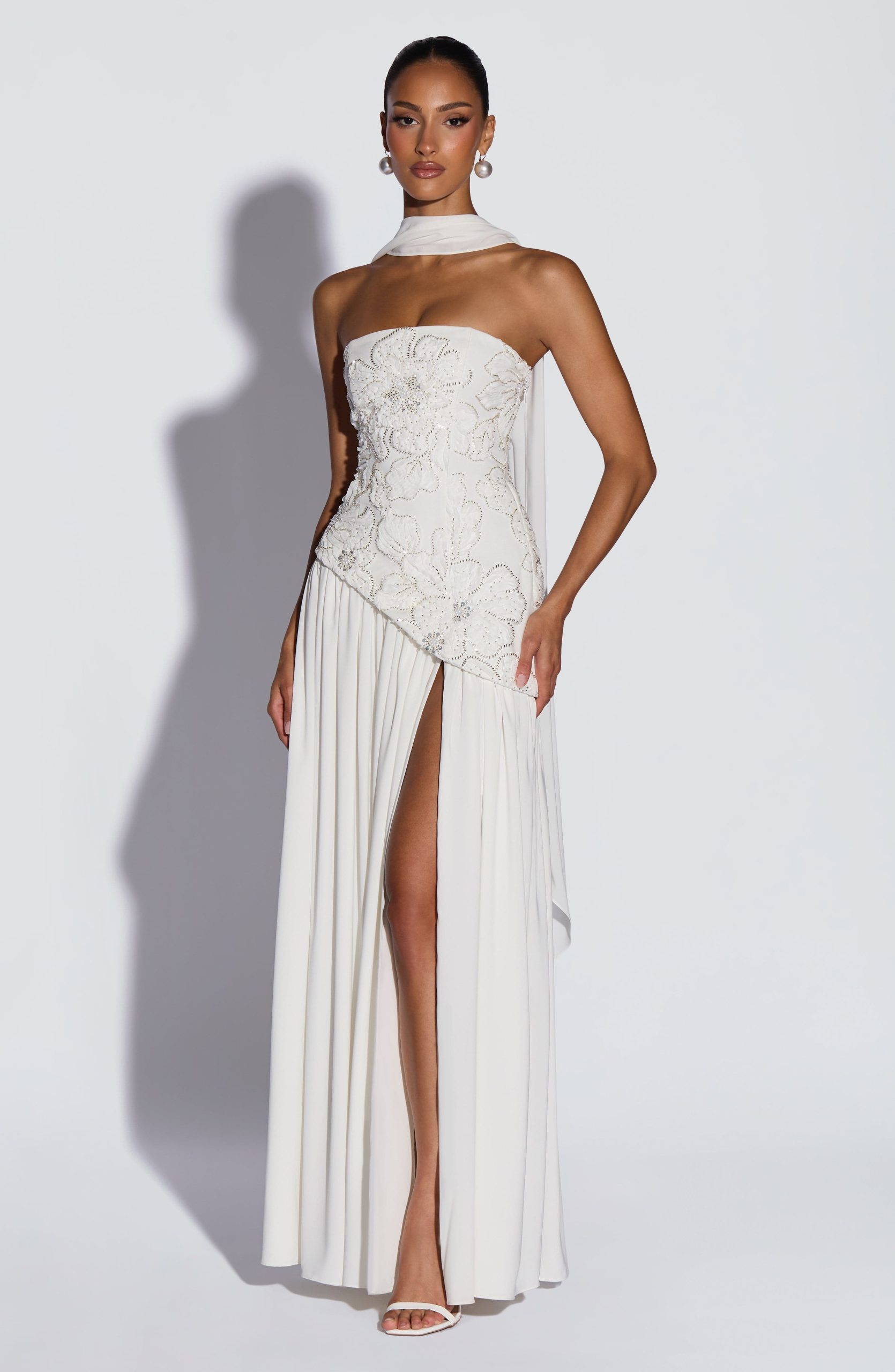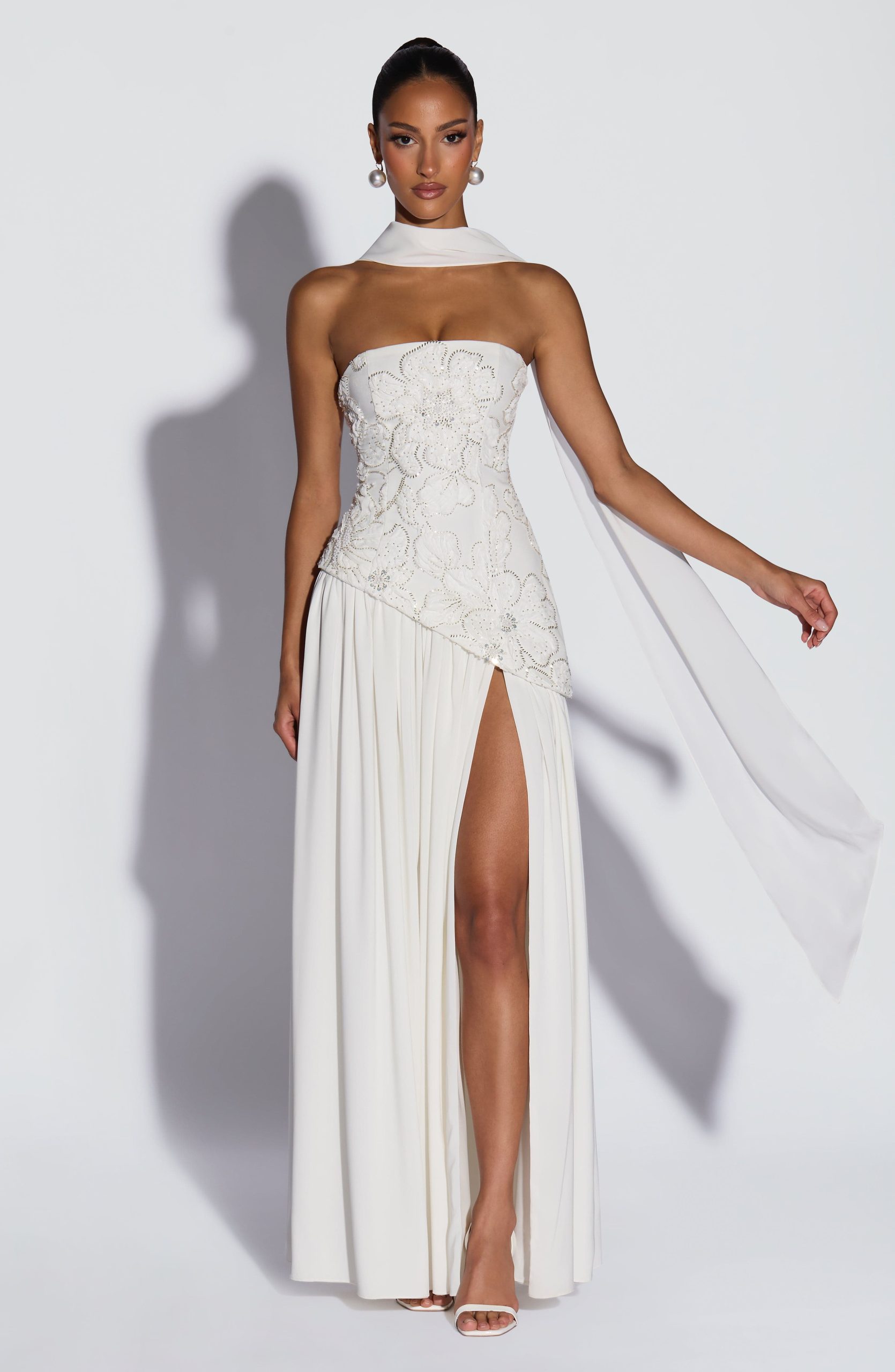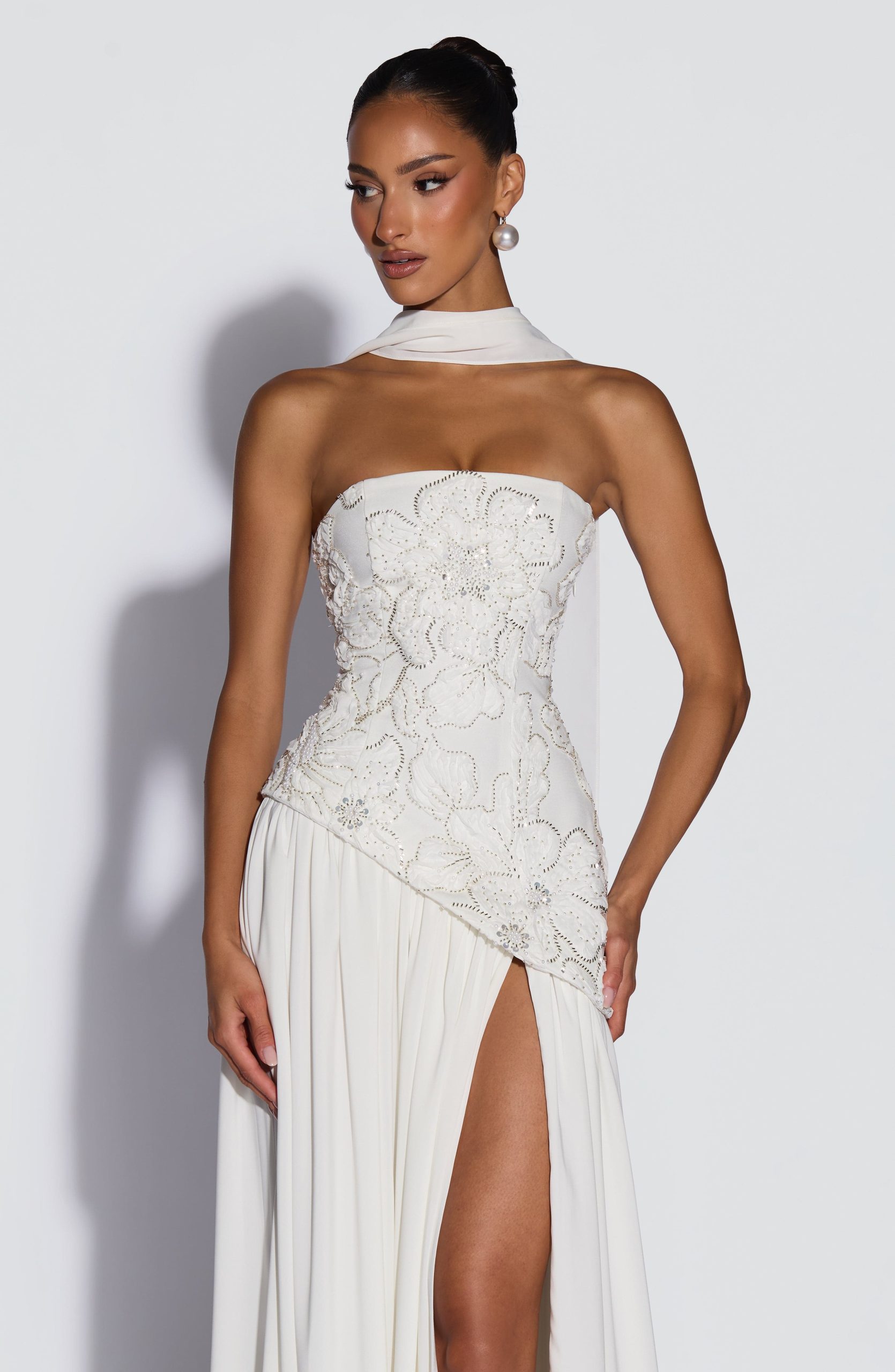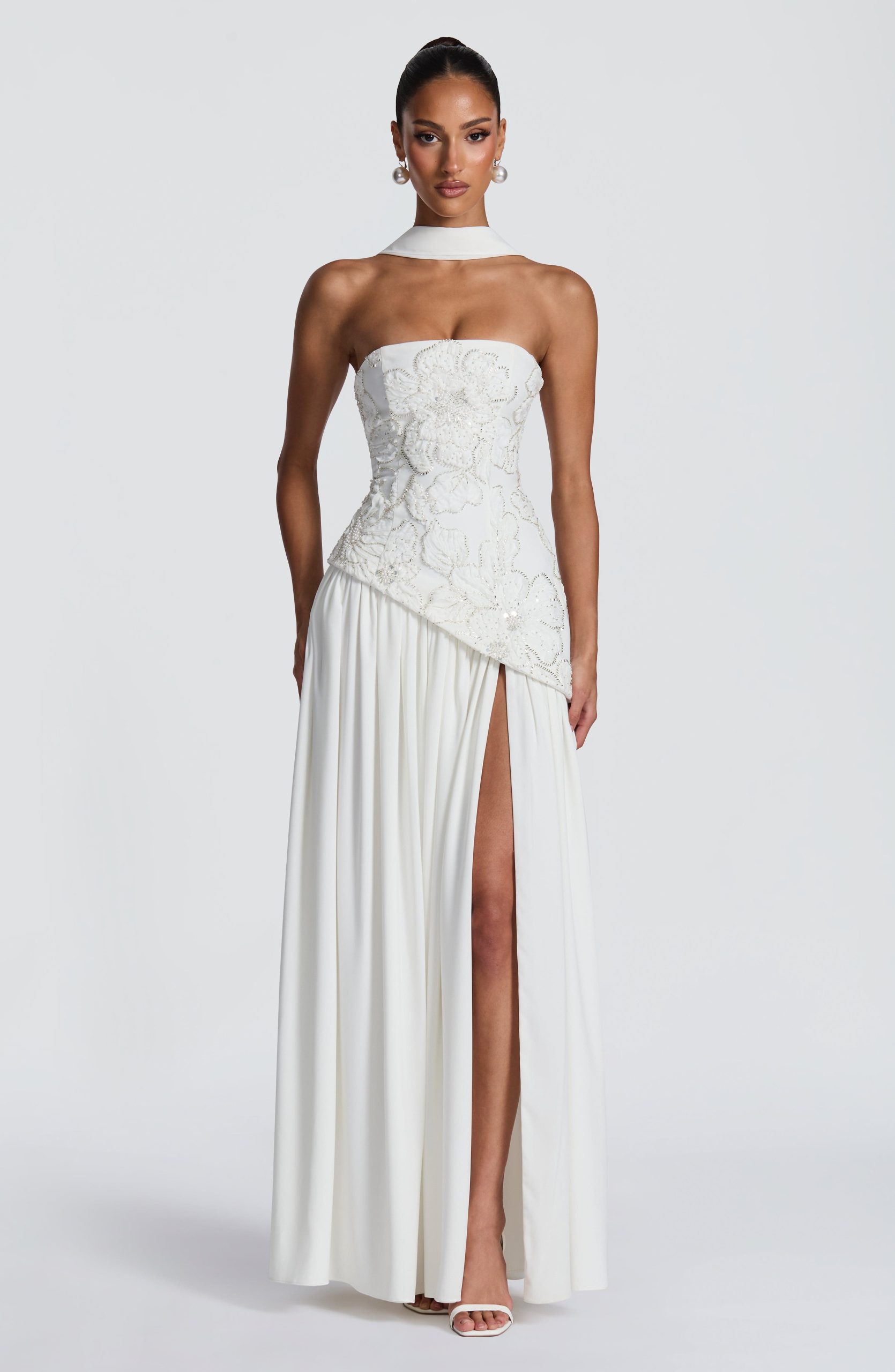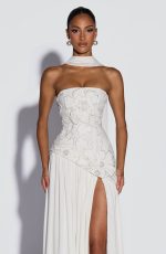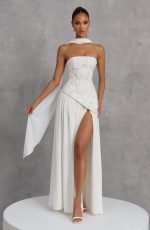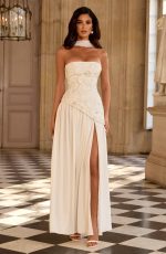 A curved asymmetric hem adds a soft, unexpected dimension, while an adjustable lace-up back cinches and sclupts the silhouette with quiet precision. A thigh-high split and matching chiffon scarf complete the look – effortless, romantic, and completely her own.