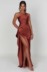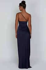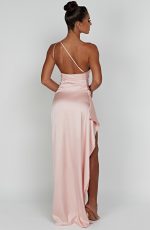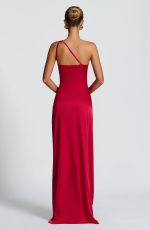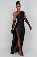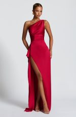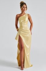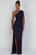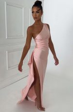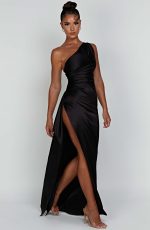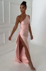 Feel like the goddess you are in Ariel, our premium gown made from luxury, lightweight satin with a stretch to hug your curves. With draped detailing and one shoulder design, the maxi dress sweeps the floor and is complete with a thigh high split. Style yours with sleek hair, a mini bag and heeled mules.