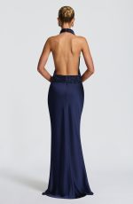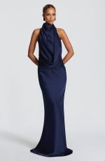 The Armelle Maxi Dress in ivory features a satin texture with a high neckline and elegant draped detailing. Its asymmetric pleated cowl and embellished waistband create a refined silhouette, while the dropped waist and lightly flared skirt offer graceful movement.