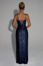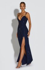 Elevate your evening with the Ashton Maxi Dress in navy. Crafted from stretch crepe and adorned with shimmering hotfix rhinestones, it features a shaped plunge neckline, delicate shoulder straps, an open lace-up back, and a thigh-high split. The column-shaped skirt completes this sophisticated silhouette.