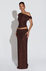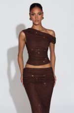 The Aveda Top in Plum Brown combines understated elegance with thoughtful design details. Crafted from mesh, this piece features a softly draped asymmetric neckline and strategic gathering through the straps and waist.