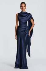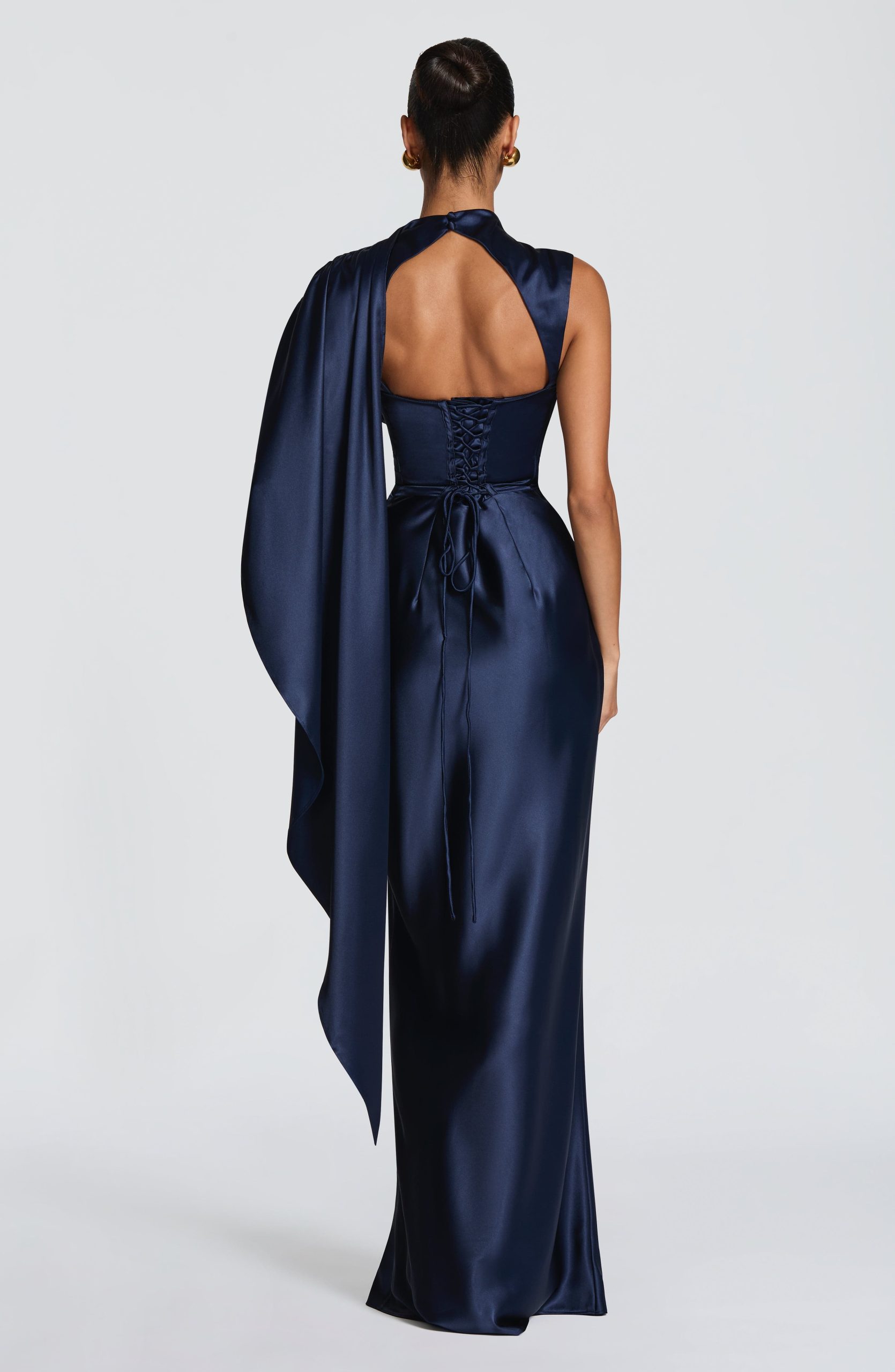 The Avendra Maxi Dress in navy features non-stretch satin with a high neckline, directional pleating, and an asymmetric draped cape overlay. Internal corset boning and a lace-up back create a sculpted, customizable fit.