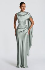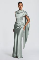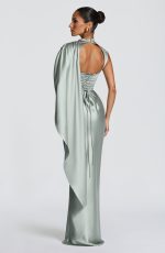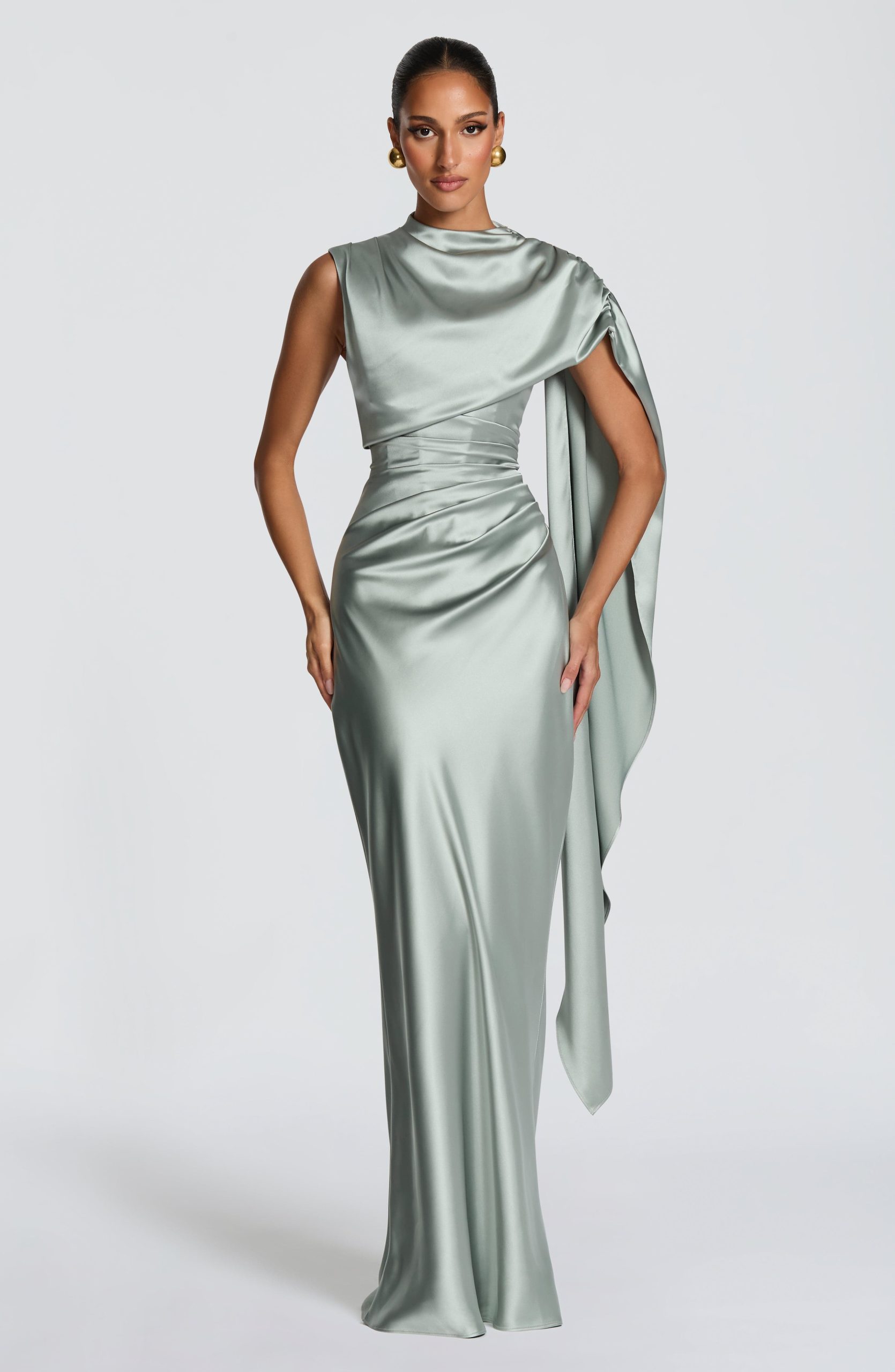 The Avendra Maxi Dress in Sage is crafted from non-stretch satin, features a high neckline, asymmetric draped cape overlay cascading across the bust and left shoulder, and pleating through the bodice. An internal corset with boning provides structure, while the lace-up back allows for a customized silhouette.