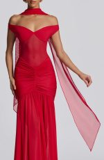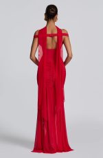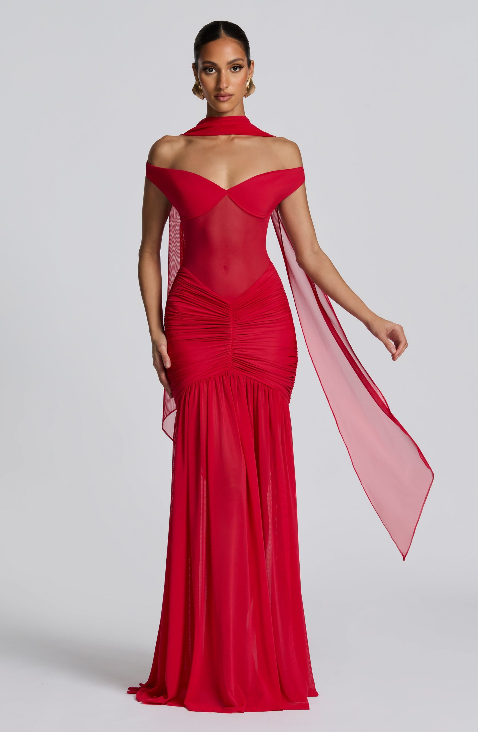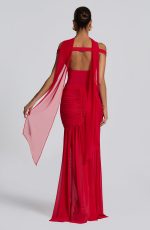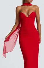 The Ayla Scarf in red features a delicate light stretch mesh fabric that drapes effortlessly around the neck, adding a refined touch to any ensemble.