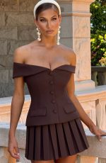The Blakely Top in Plum Brown is a timeless blend of elegance and modern edge. Crafted from refined non-stretch crepe, this top features a striking fold bardot neckline that accentuates the shoulders The single-breasted button-down front and longline bodice create a structured yet feminine silhouette, perfect for any occasion. For a coordinated and polished ensemble, style it with the Gretchen Mini Skirt in Plum Brown.