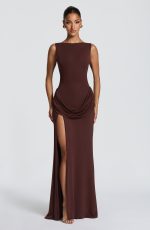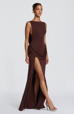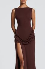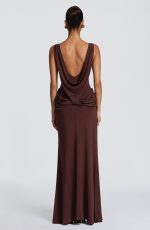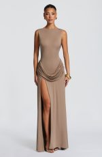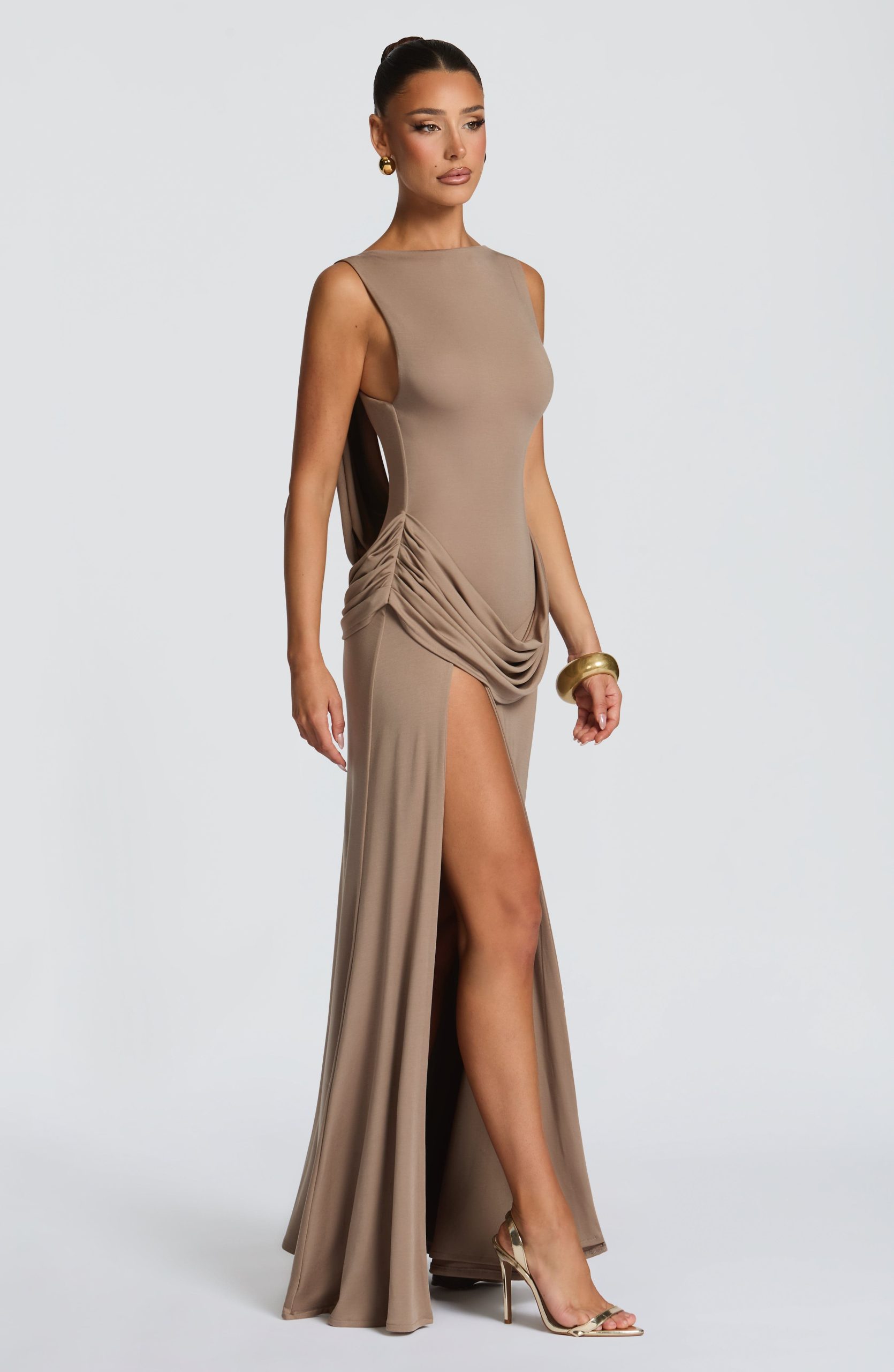 The Bruna Maxi Dress in Stone is crafted from luxuriously soft modal jersey, this sophisticated piece features a fitted bodice with a striking high, wide neckline and dramatic low back with shaped cowl panel. A graceful draped hip panel and thigh-high split create fluid movement and refined allure.