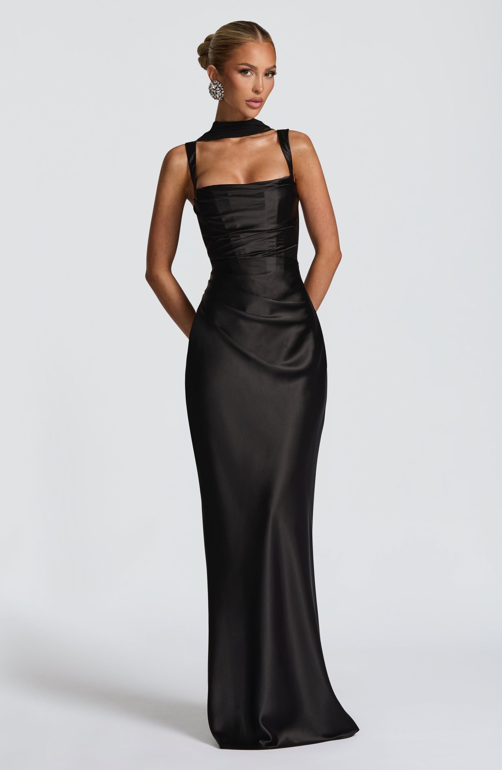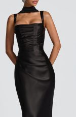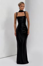 Elevate your elegance with the Calanthe Maxi Dress in black satin. Featuring a square neckline with delicate pleated accents, asymmetric pleats on the bodice, tapered straps, and a lace-up back for a refined, tailored fit.