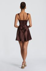 Calanthe Mini Dress in plum brown satin delivers understated luxury through thoughtful design details. The square neckline frames pleated accents across the bodice, while asymmetric pleating adds visual depth. Tapered straps ensure a refined fit, and the lace-up back provides an elegant finishing touch.