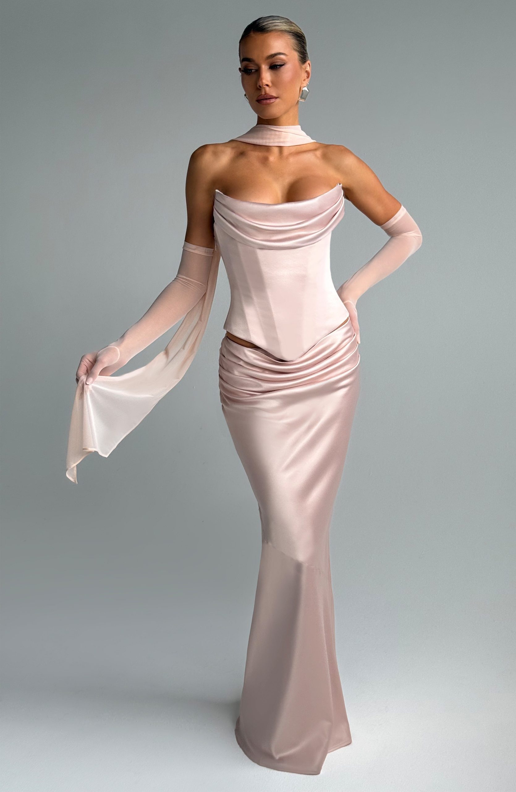 The Callista Corset in Hazel is effortlessly chic and beautifully structured. Featuring a strapless scoop neckline with a pleated cowl, it’s designed for a flattering, feminine silhouette. The boned bodice and lace-up back ensure a perfectly snatched fit, while the longline design and shaped hem add a sleek finish. Style with the with the Eli Gloves, Ayla Scarf and Bernadette Skirtfor a flawlessly coordinated look.