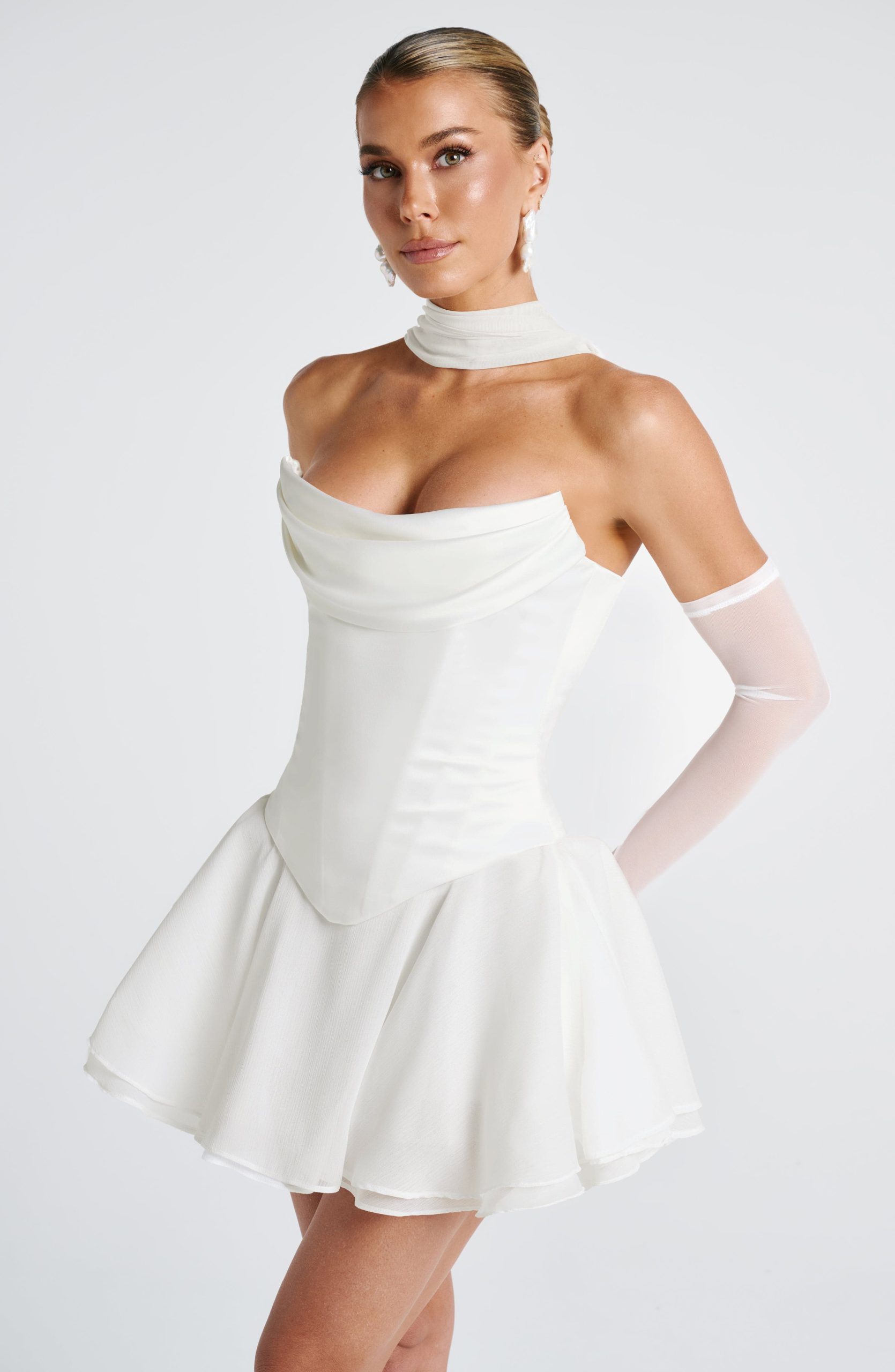 The Callista Corset in Ivory exudes refined elegance and is designed to sculpt and flatter the body with its luxe satin fabric. Featuring boning in the bodice for structure and support, this longline corset offers a graceful strapless cowled neckline that adds a soft, sophisticated touch. The lace-up back allows for an adjustable, customised fit, while the shaped hem creates a flattering, feminine silhouette. Pair it with the Eli Gloves, Ayla Scarf and Bernadette Skirt for an elegant, formal look or style it with the Reagan Skort for a chic, modern ensemble.