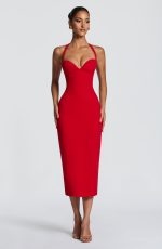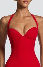The Cassia Midi Dress in red is crafted from non-stretch crepe, this figure-hugging silhouette features a lightly padded, underwired bodice with delicate lace trim detailing. Halterneck straps provide secure support, while the midi-length pencil skirt creates a polished, elongated line.