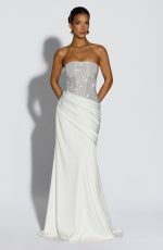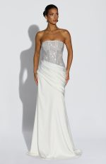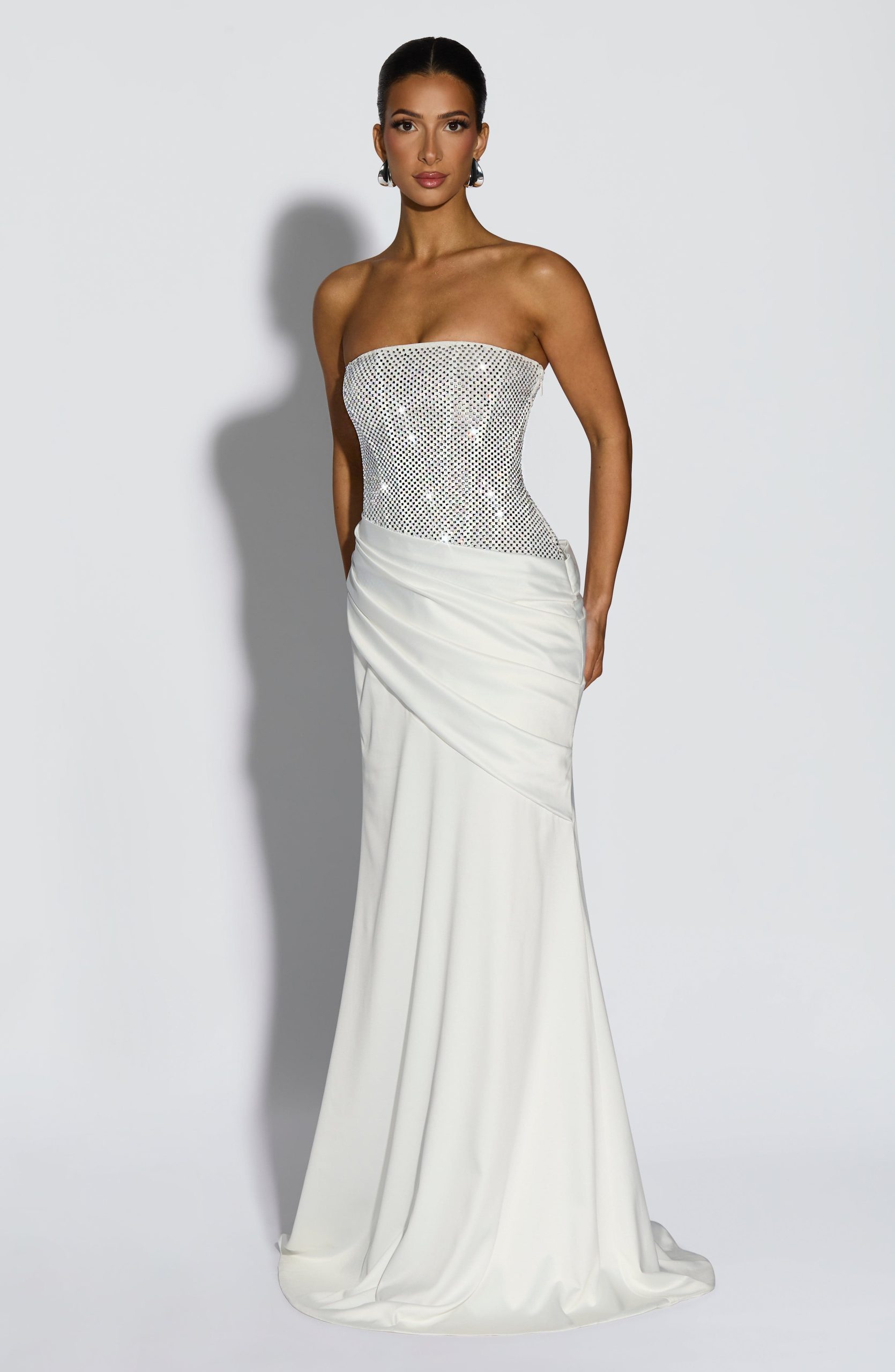 The Celestia Maxi Dress in ivory features a strapless corset bodice with internal boning and an open lace-up back for a flattering fit. Embellished with square hotfix rhinestones, it pairs elegantly with a satin maxi skirt that includes an asymmetric pleated panel across the hips.