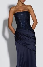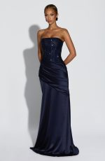 The Celestia Maxi Dress in navy features a strapless corset bodice with internal boning and an open lace-up back for an elegant fit. Adorned with square hotfix rhinestones, it combines sparkle with sophistication. The satin skirt showcases a dropped waist and an asymmetric pleated panel, creating graceful movement and refined style.