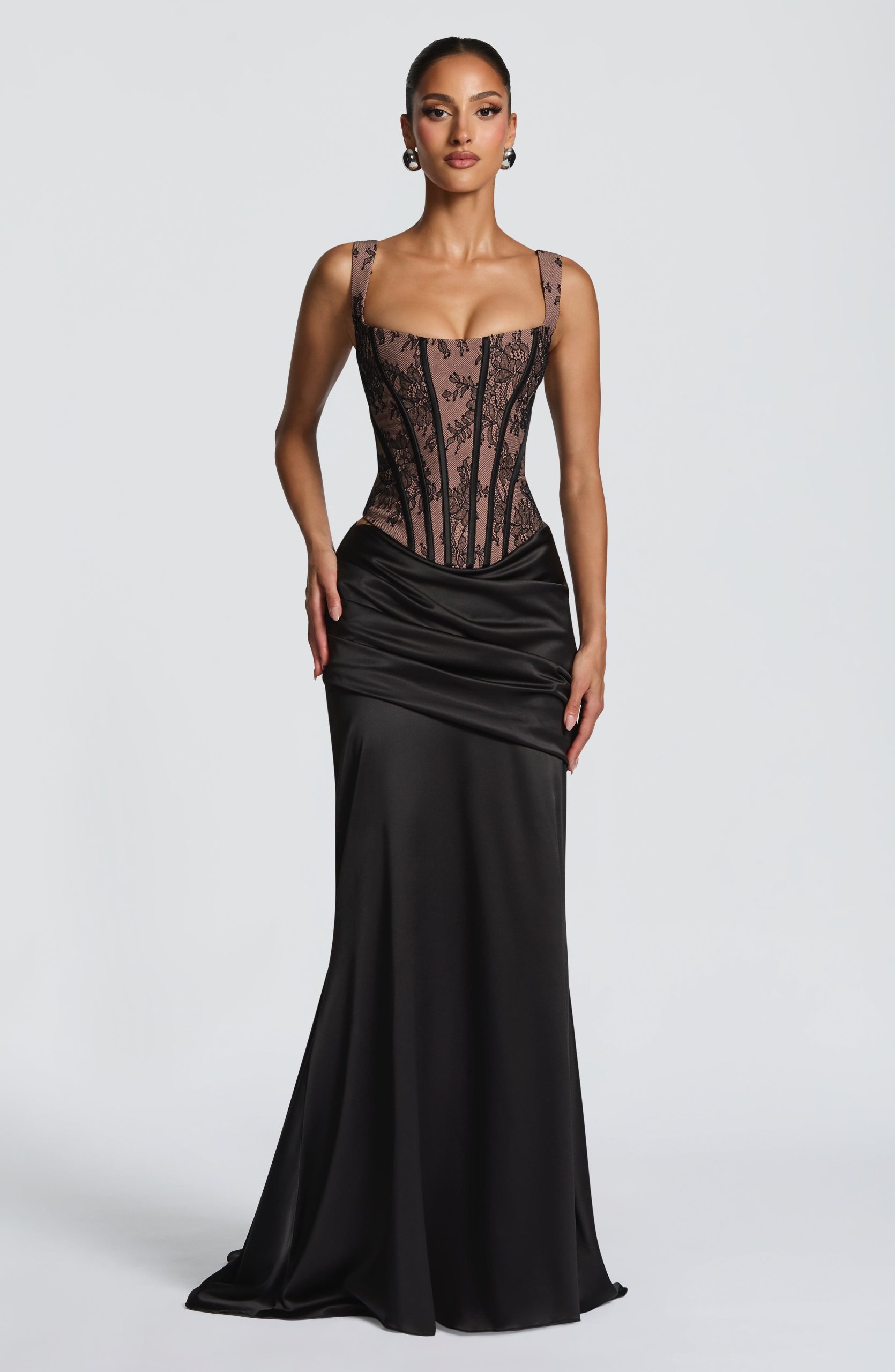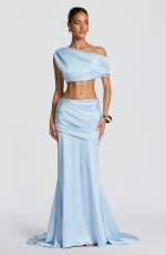 The Claudette Maxi Skirt in Glacier Blue combines fluid elegance with architectural design. Crafted from luxurious stretch satin, this mid-rise silhouette features an asymmetric pleated panel across the hips and a graceful fit-and-flare cut with subtle train.