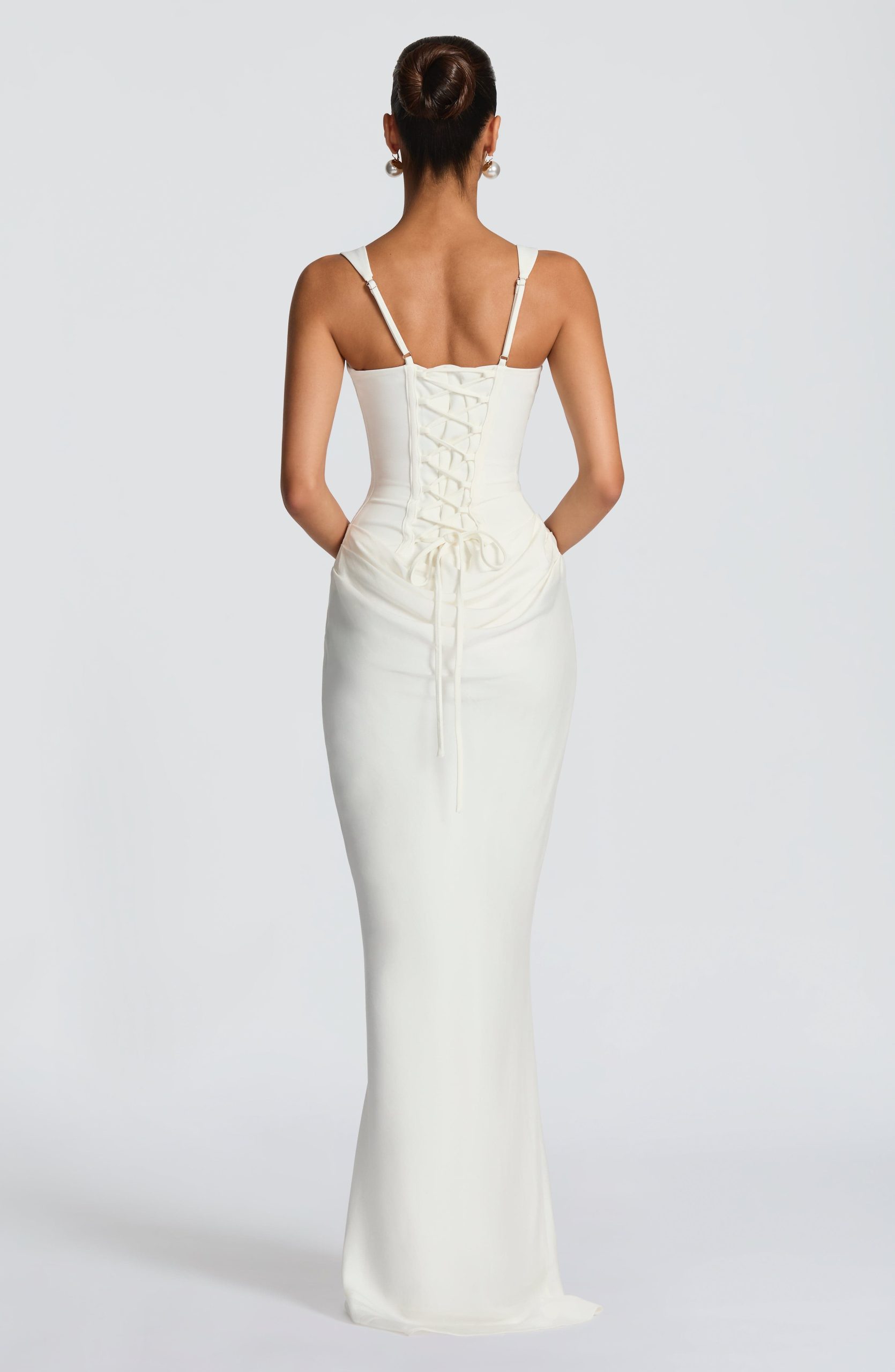 The Cornelia Maxi Dress in ivory showcases structured elegance with a boned crepe bodice, square neckline, and tapered straps. Fluid lyocell skirt features a satin cowl overlay with deep pleats and dropped waist. Adjustable lace-up back ensures a personalized fit for evening occasions.