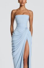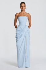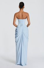 Cyra Maxi Dress in luxurious glacier blue chiffon. Features a strapless neckline with directional pleating, internal corset with lace-up back for a sculpted silhouette, and asymmetric draping that flows into a column skirt. Thigh-high split adds movement and elegance.
