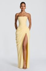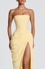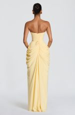 The Cyra Maxi Dress in lemon chiffon features a striking strapless neckline with directional pleating through the bodice. An internal corset with lace-up back creates a cinched silhouette, while asymmetric draping flows elegantly across the hips into a column-shaped skirt. A thigh-high split adds movement and sophistication to this statement piece.