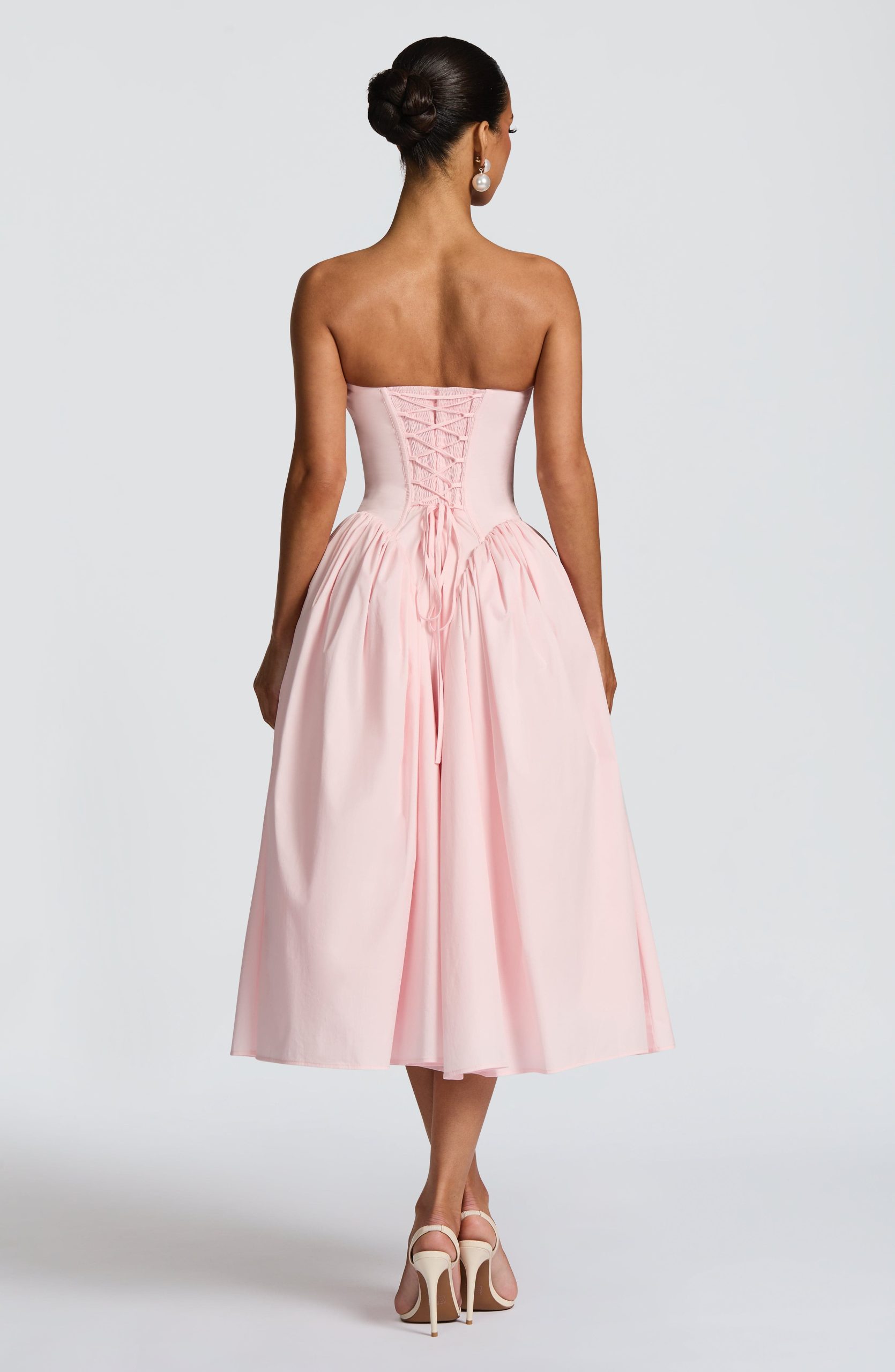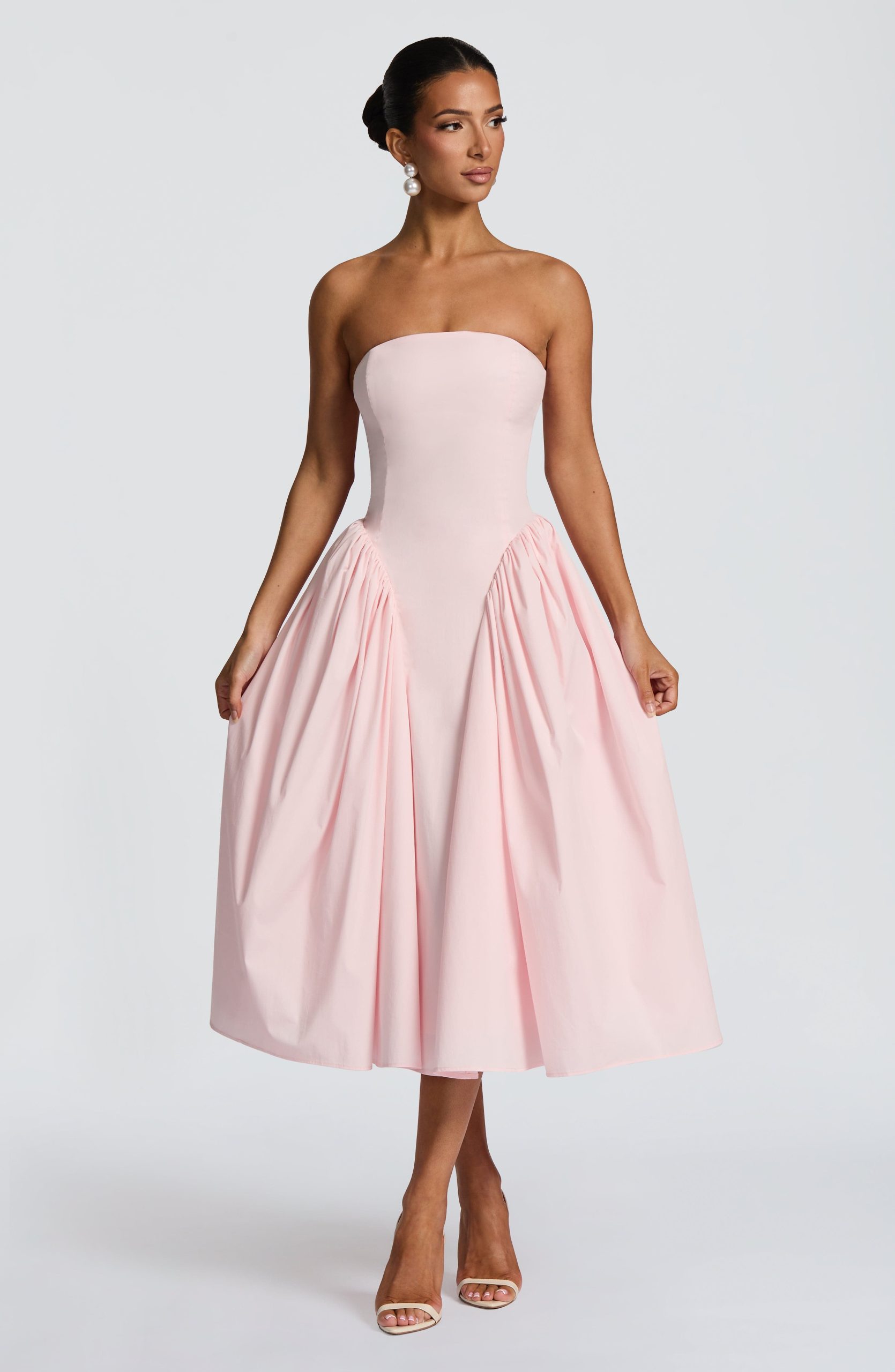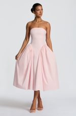 The Darla Midi Dress in blush combines a strapless neckline with boning and a corseted back for a refined fit. Its full skirt with internal tulle and gathered godets adds graceful volume.