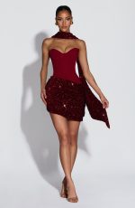 - Sequin embellished velvet skirt with asymmetric pleated cowl overlay.
