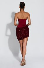 The Denise Mini Dress pairs a structured crepe bodice with internal boning and strapless cupped neckline against a sequin-embellished velvet skirt with asymmetric pleated cowl. The lace-up back creates a customizable cinched silhouette. Timeless sophistication for evening wear.