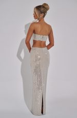Indulge in luxury with our Dimity Maxi Skirt in Nude. Crafted from premium stretch mesh and fully lined for comfort, this column shape skirt features large square hotfix rhinestones elegantly encrusted on the fabric. Finished with an invisible zipper fastening, this maxi-length skirt is both sophisticated and exclusive. Wear with the Dimity crop top and shine all night.