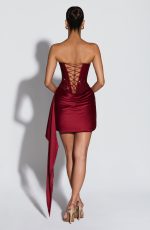 The Ebony Mini Dress in Plum Brown has a stretch net and mesh bodice, adorned with square hofit rhinestones, flows into a satin cowl overlay skirt with dramatic deep pleats and a sculpted hip panel. The strapless corset bodice features internal boning and an open lace-up back for a customizable, cinched silhouette.