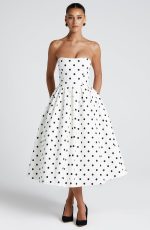 The Edith Midi Dress in Polka Dot is a timeless classic that exudes vintage-inspired charm with a modern twist. Made from stretch bengaline fabric, this dress offers a flattering fit that moves with you. The strapless neckline and boned bodice provide support and accentuate the silhouette, while the full skirt with inverted box pleats at the waist adds a touch of playful sophistication.
