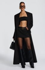 The Edna Mini Skirt in black features a tailored fit crafted from non-stretch woven suiting fabric. Designed with belt loops and discreet double welt pockets at the front, it offers a polished, refined look perfect for stylish occasions.