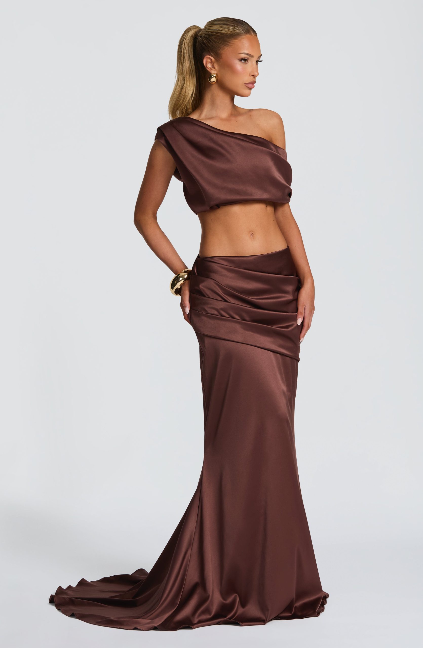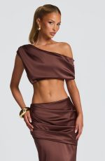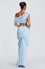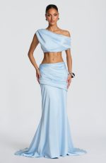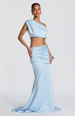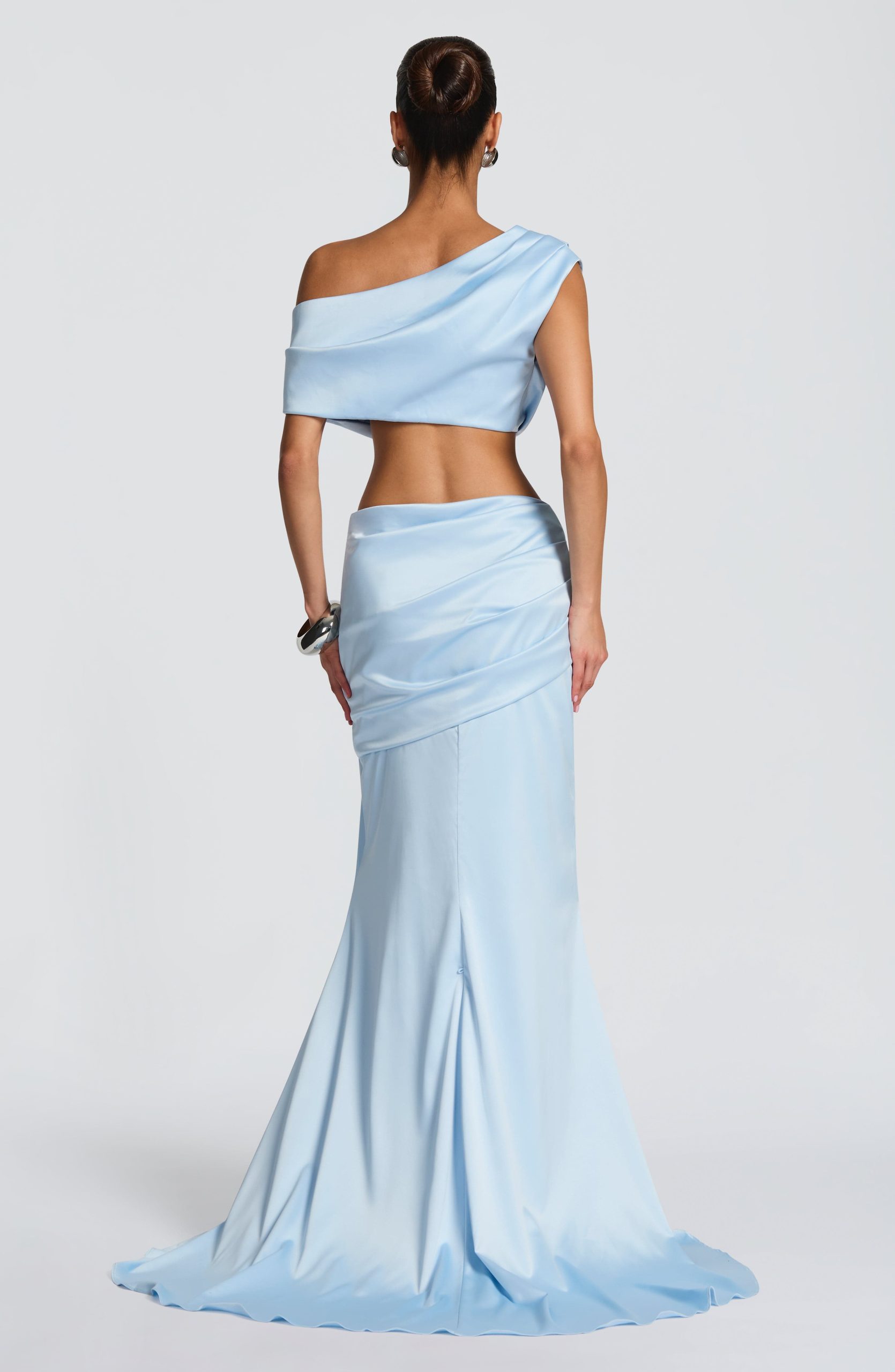 The Edwina Top in glacier blue combines understated elegance with modern design. This cropped stretch satin piece showcases a one-shoulder neckline with pleated detailing and an arm button closure for refined sophistication.