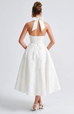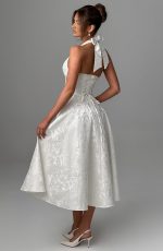 A show stopping dress that exudes romantic, timeless elegance – meet Effie. Offering a sophisticated silhouette, it features a full midi skirt made with tulle for added volume, and a super cinched bodice with boning to snatch the waist. With a plunge halter neckline and lace up back for your perfect fit, it’s crafted in our luxe floral jacquard which feels super feminine and classic.