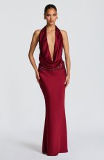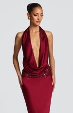 Indulge in pure sophistication with our Eleni Bodysuit in luxurious burgundy textured satin. Featuring a deep plunging neckline with an asymmetric draped cowl and halterneck straps, this backless bodysuit exudes exclusivity and style.