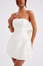 THE dress of the season has landed and you’re going to be obsessed. Meet Elenora, our dreamy mini with a pretty structured skirt and waist cinching bodice. This strapless style is complete with lace up and an oversized bow to the back for perfect feminine drama.