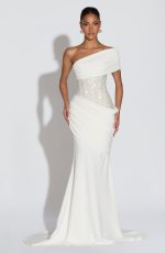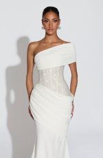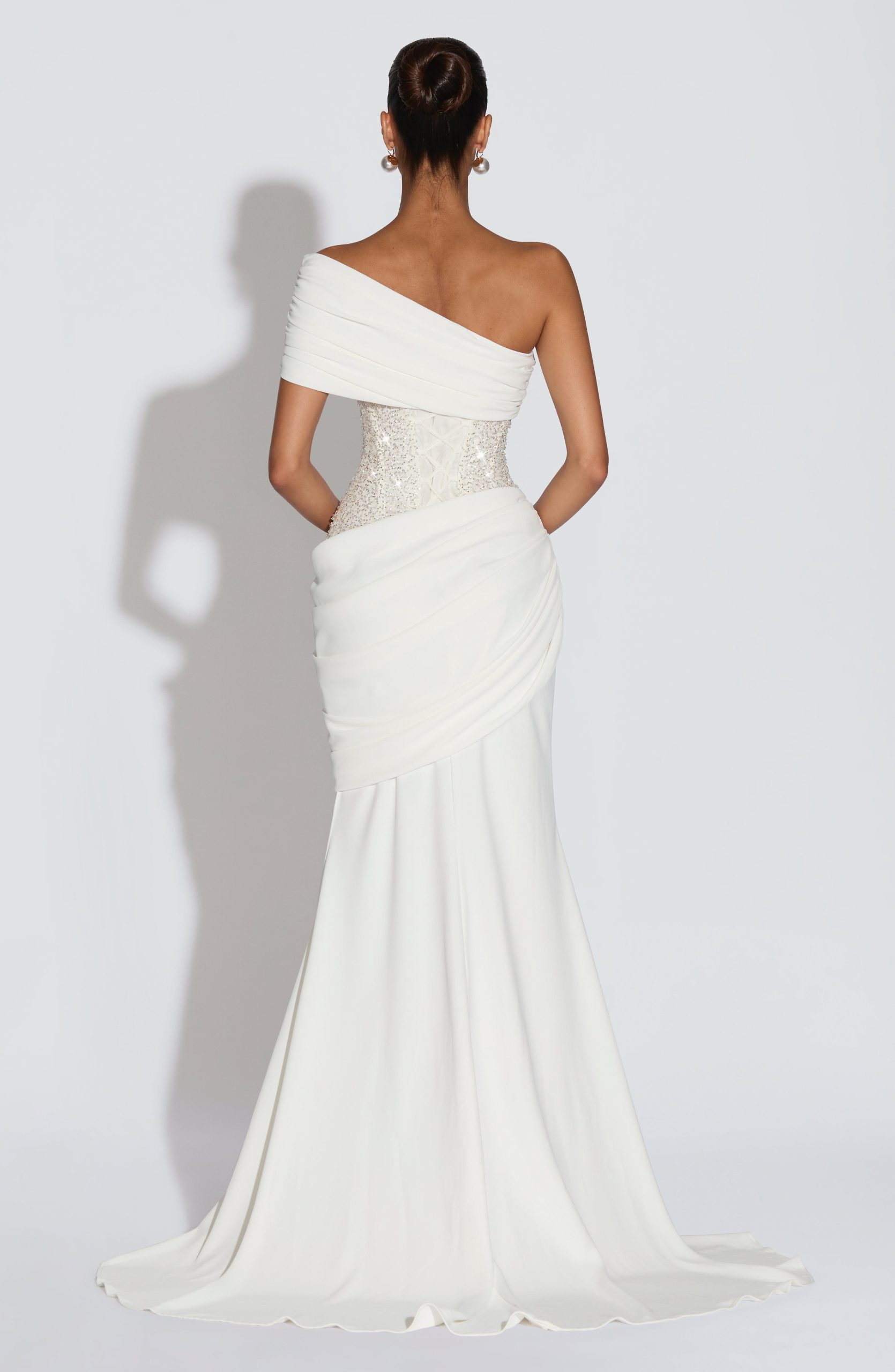 The Ellora Gown in ivory features a semi-sheer embellished bodice with contrast binding and an asymmetric off-the-shoulder neckline, it pairs with a lightweight crepe skirt that gently flares into a train. Pleated draped panels at the hips and a lace-up back detail complete this refined silhouette.