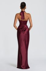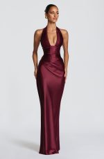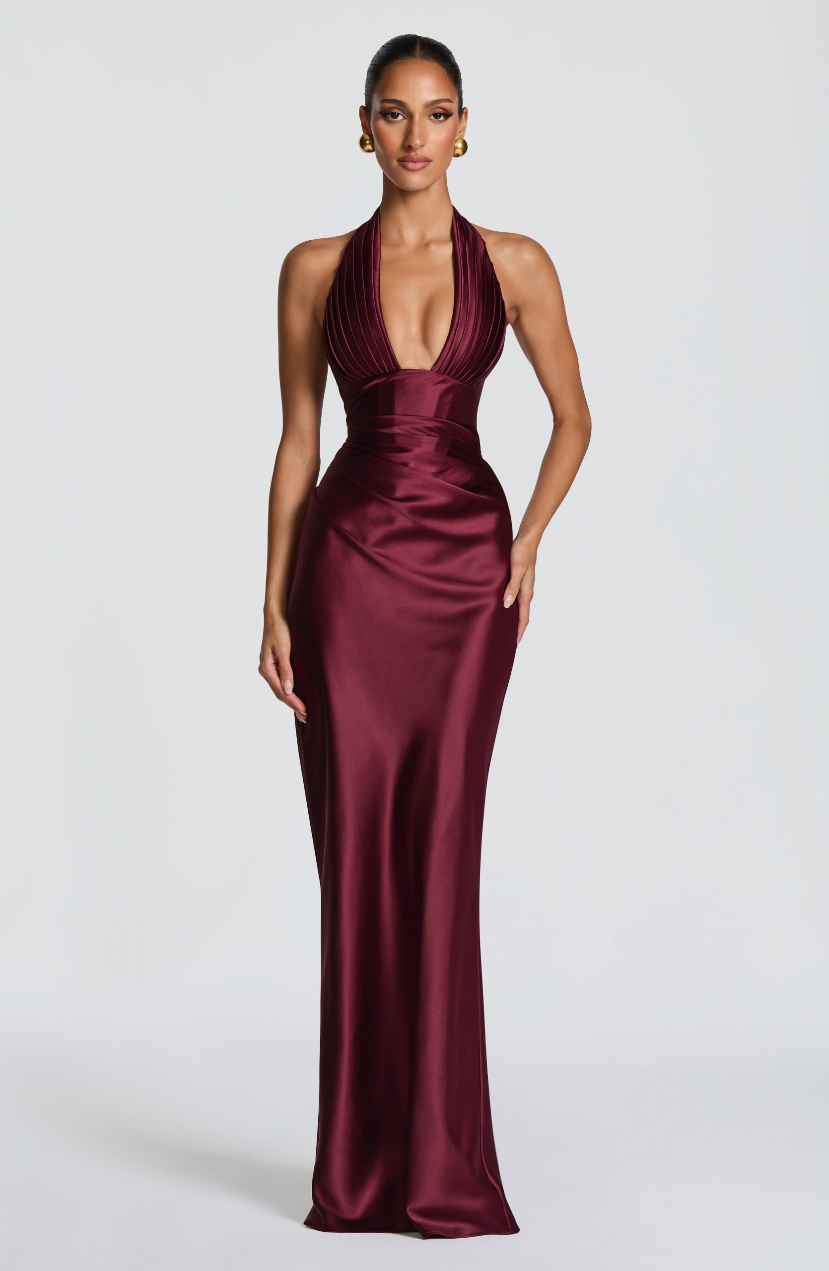 The Elowen Maxi Dress in Cherry Lacquer is crafted from non-stretch satin, featuring a plunging halter neckline with pleated cups and asymmetric bodice pleating for dimensional interest. An internal corset and lace-up back allow for a customizable, cinched silhouette, while the bias-cut maxi skirt drapes with fluid grace.