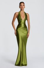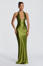The Elowen Maxi Dress in olive showcases a plunge halter neckline and sculptural pleated cups that frame the silhouette. An internal corset and lace-up back create a customizable cinched fit, while asymmetric pleating adds movement through the bodice. The bias-cut skirt flows to maxi length in luxurious non-stretch satin.