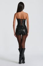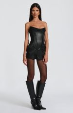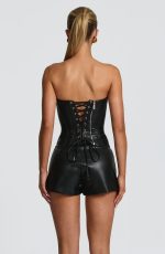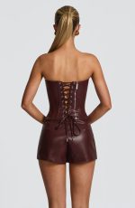 The Elvina Corset in rich burgundy faux leather features a scooped neckline with a pleated cowl and a structured, boned bodice for a refined silhouette. Its open lace-up back with eyelets and shaped hem add elegant detail.