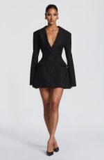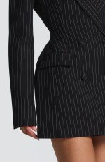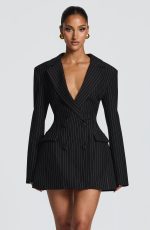 Discover the Elvira Mini Dress in Black Pinstripe with structured shoulder pads and a cinched waist for definition. Double-breasted front with notched lapels creates a polished, editorial silhouette. Non-stretch woven fabric holds its shape beautifully.