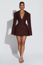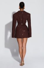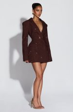 Elevate your evening with the Elvira Mini Dress in plum brown. This tailored silhouette features a double-breasted cut, cinched waist, and structured shoulder pads for a polished, editorial look. Round hotfix rhinestones catch the light across the non-stretch woven suiting, while the notched lapel collar adds refined detail.